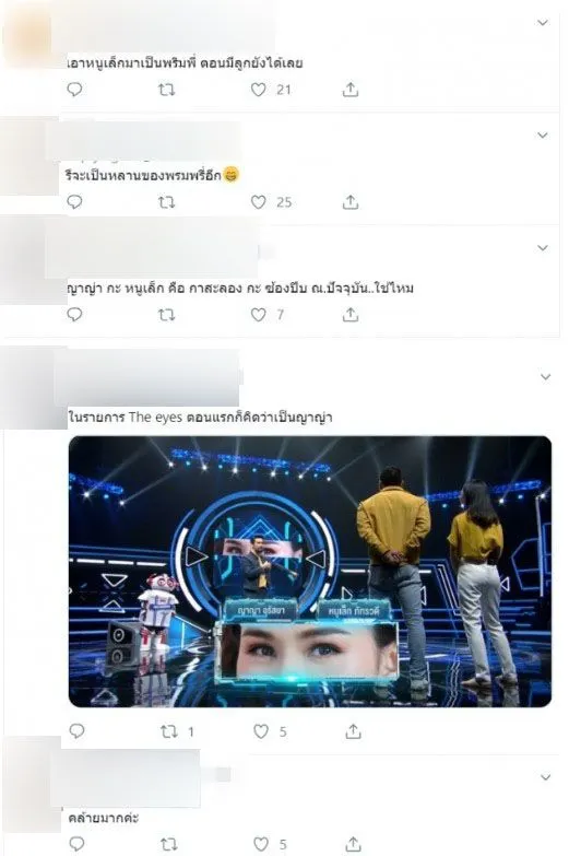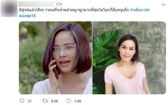 แต่ที่ถูกพูดถึงกันเป็นอย่างมากก็คง จะเป็น EP15 ซึ่งเป็นตอนอวสานของเรื่อง ที่งานนี้แฟนละครกับโฟกัสที่หน้าตาของสาวญาญ่า ที่ดูอย่างไรก็ละม้ายคล้ายคลึง กับคุณแม่ลูกหนึ่ง อย่าง “หนูเล็ก ก่อนบ่าย” เหมือนอย่างกับแฝด งานนี้ถึงมีผู้แอคเค้าท์ทวิตรายหนึ่งได้นำทั้งสองคนมาเปรียบเทียบกัน จนต้องยอมรับเลยว่าคล้ายกันมากเลยละค่าาา