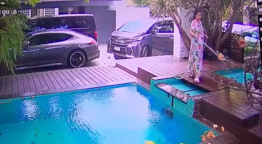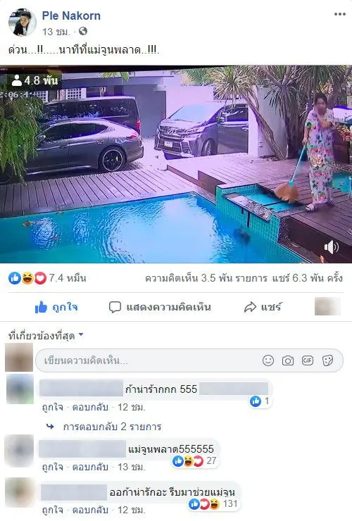 เป็นคลิปเหตุการณ์ที่ทั้งขำและตกใจเลยค่าาา หลัง นักแสดงตลกชื่อดังอย่าง เปิ้ล นาคร ออกมาเผยภาพจากกล้องวงจรปิดในบ้าน ตอนที่กำลังจับภาพภรรยาสาว จูน กษมา กำลังทำงานบ้านแล้วเกิดพลาด !! เพราะในคลิป แม่จูน ก็มีการกวาดใบไม้ -รดดำน้ำต้นไม้แถวบริเวณหน้าบ้านและจู่ๆก็เดินไปตรงขอบสระน้ำ