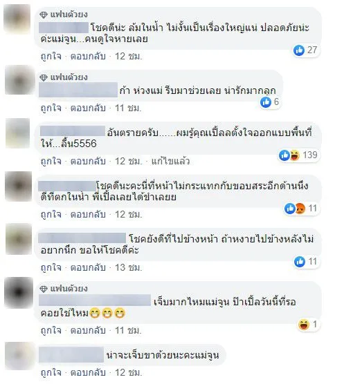 ซึ่งขอบสระนั้นเล็กมาก แม่จูนก็เลยพลาดล้มร่วงน้ำ งานนี้แฟนคลับก็เข้ามาคอมเม้นท์ขำสนั่นแต่บางคนก็มองว่าเป็นโชคดีของ แม่จูน ที่ล้มลงไปในน้ำเพราะถ้าล้มหงายหลังคงเป็นเรื่องใหญ่แน่ เอาเป็นว่าเหตุการณ์จะเป็นยังไงไปดูกันเลยดีกว่าค่ะ ยังไงก็ขอให้หายเจ็บไวๆนะคะแม่จูน