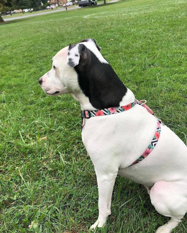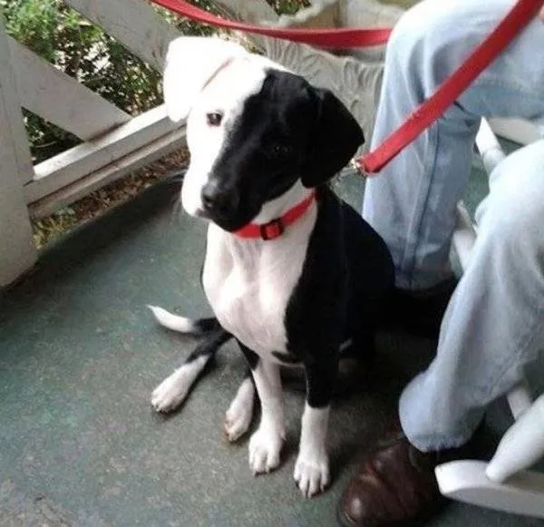 น้องหมาที่มีลายสีขาวดำตัดกันตรงกลางใบหน้าพอดี