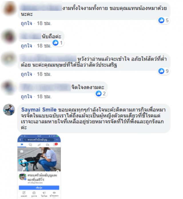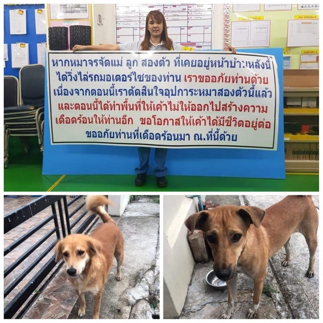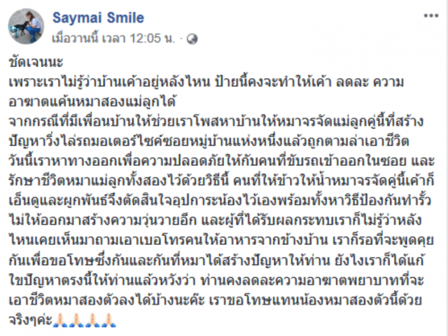 ในโลกออนไลน์ได้มีการแห่แชร์ภาพจาก เฟซบุ๊ก Saymai Smile ซึ่งถือป้ายข้อความว่า หากหมาจรจัดแม่ลูกสองตัวที่เคยอยู่หน้าบ้านหลังนี้ได้วิ่งไล่มอเตอร์ไซค์ของท่าน เราขออภัยท่านด้วย เนื่องจากตอนนี้เราตัดสินใจอุปการะหมาสองตัวนี้แล้ว และตอนนี้ได้ทำพื้นที่ให้เค้า ไม่ให้ออกไปสร้างความเดือดร้อนให้ท่านอีก ขอโอกาสให้เค้าได้มีชีวิตอยู่ต่อ ขออภัยท่านที่เดือดร้อน มา ณ ที่นี้ด้วย