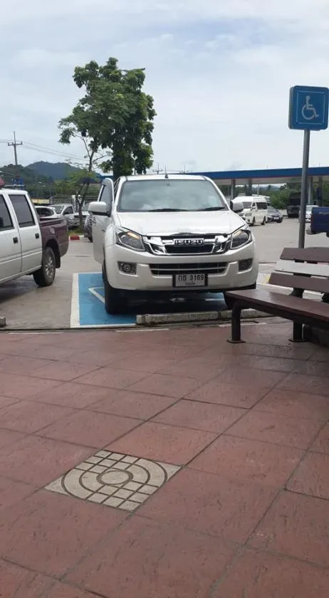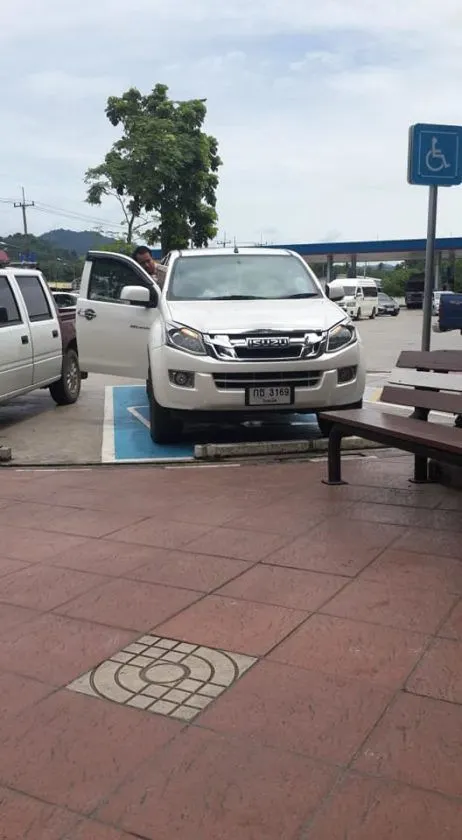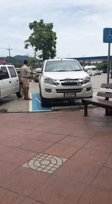 ของชายคนหนึ่ง ซึ่งคาดว่าเป็นครู ได้จอดรถในเขตพื้นที่จอดรถเฉพาะคนพิการ ก่อนที่จะเดินลงไปซื้อกาแฟ