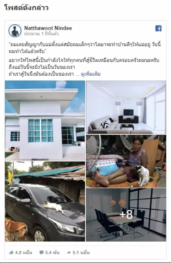 โดยในเฟซบุ๊ก Natthawoot Nindee ช่างภาพฟรีแลนซ์หนุ่มวัย ๒๗ ปี โพสต์ภาพบ้านที่สร้างเสร็จสมบรูณ์ ที่ภายนอกดูเป็นบ้านที่น่ารักแสนอบอุ่น แต่ภายใน หรูหราเกินราคาเป็นอย่างมาก พร้อมระบุว่า ผมเคยสัญญากับแม่ตั้งแต่สมัยผมเด็กๆว่าโตมาจะทำบ้านดีๆให้แม่อยู่ วันนี้ผมทำได้แล้วครับ