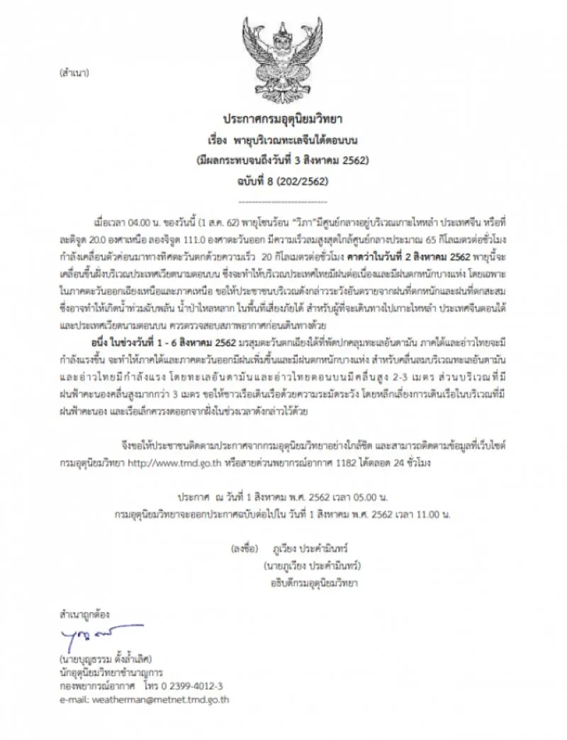 วันที่ 1 ส.ค. 2562 กรมอุตุนิยมวิทยาไดออกประกาศเตือน ฉบับที่ 8 กรณีเรื่อง"พายุบริเวณทะเลจีนใต้ตอนบน (มีผลกระทบจนถึงวันที่ 3 สิงหาคม 2562)"ระบุว่า... เมื่อเวลา 04.00 น. ของวันนี้ (1 ส.ค. 62) พายุโซนร้อน วิภา มีศูนย์กลางอยู่บริเวณเกาะไหหลำ ประเทศจีน หรือที่ ละติจูด 20.0 องศาเหนือ ลองจิจูด 111.0 องศาตะวันออก มีความเร็วลมสูงสุดใกล้ศูนย์กลางประมาณ 65 กิโลเมตรต่อชั่วโมง กำลังเคลื่อนตัวค่อนมาทางทิศตะวันตกด้วยความเร็ว 20 กิโลเมตรต่อชั่วโมง คาดว่าในวันที่ 2 สิงหาคม 2562 พายุนี้จะเคลื่อนขึ้นฝั่งบริเวณประเทศเวียดนามตอนบน ซึ่งจะทำให้บริเวณประเทศไทยมีฝนต่อเนื่องและมีฝนตกหนักบางแห่งโดยเฉพาะในภาคตะวันออกเฉียงเหนือและภาคเหนือ ขอให้ประชาชนบริเวณดังกล่าวระวังอันตรายจากฝนที่ตกหนักและฝนที่ตกสะสม ซึ่งอาจทำให้เกิดน้ำท่วมฉับพลัน น้ำป่าไหลหลากในพื้นที่เสี่ยงภัยได้ สำหรับผู้ที่จะเดินทางไปเกาะไหหลำ ประเทศจีนตอนใต้ และประเทศเวียดนามตอนบน ควรตรวจสอบสภาพอากาศก่อนเดินทางด้วย