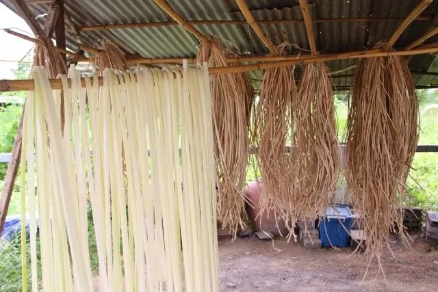 นายธนกร สดใส เจ้าของบ้านศูนย์เรียนรู้ช่างสกุลบายศรี และวิสาหกิจชุมชนบ้านช่างสกุลบายศรี กล่าวว่า ที่ศูนย์ฯ ส่วนใหญ่จะเป็นงานจักสาน เช่น ตระกร้า กระเป๋าที่ออกแบบตามออเดอร์ที่ลูกค้าสั่งเข้ามา ที่เห็นนี้จะเป็นตัวอย่างที่ผสมผสานกับยีนส์ ส่วนอีกประเภทจะเป็นผลิตภัณฑ์ใช้กาบกล้วยเป็นเส้น ๆ ตากแดดแล้วอบให้แห้ง นำมาสานประดิษฐ์เป็นงานรูปแบบใหม่ ๆ ที่ลูกค้าสั่ง เป็นการใช้วัสดุจากธรรมชาติที่สร้างสรรค์ออกมาได้อย่างสวยงาม