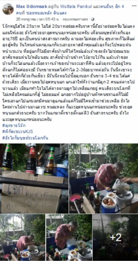 จากกรณ๊ที่ชาวเน็ตแห่แชร์กันเป็นจำนวนมาก โดยเมื่อวันที่26 กรกฎาคม ที่ผ่านมา ผู้ใช้เฟสบุ๊คที่ใช้ชื่อว่า Max Udomsak ได้โพสต์เรื่องราวของคุณตาท่านหนึ่งที่สู้ชีวิต ขายโจ๊ก หาเลี้ยงตัวเอง โดยได้ระบุข้อความว่า...