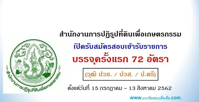 (แชร์)สำนักงานการปฏิรูปที่ดินเพื่อเกษตรกรรม เปิดรับสมัครสอบเข้ารับราชการ 72 อัตรา วันที่ 15 ก.ค. - 13 ส.ค. 2562