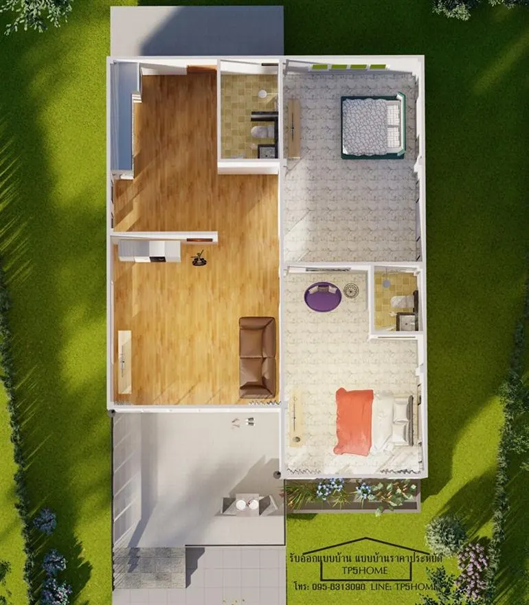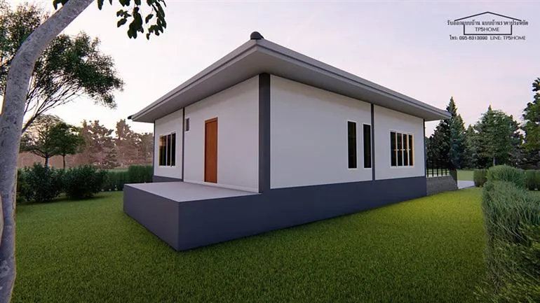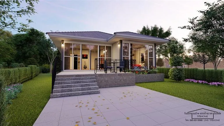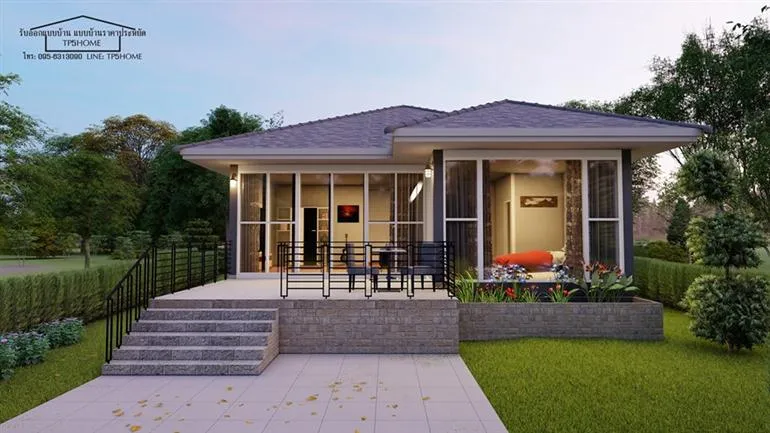 ยังคงมีแบบบ้านน่าสนใจจาก TP5HOME มาฝากกันเช่นเคย เพจรับออกแบบบ้าน แบบบ้านราคาประหยัด แห่งนี้ยังคงดีไซน์บ้านสวยๆ มีแบบบ้านแจ่มๆ มาให้ทุกท่านได้ชมกันตลอด สำหรับหลังนี้มาในแบบบ้านชั้นเดียว ทรงปั้นหยา ดีไซน์สวยงามทันสมัย ตัวบ้านภายนอกนั้นออกแบบให้ยกพื้นสูงขึ้น มีระเบียงหน้าบ้านเป็นพื้นที่พักผ่อนสำหรับครอบครัว หน้าบ้านนั้นใช้กระจกบ้านใหญ่เป็นงานประตูและผนังทั้งหมด รับแสงธรรมชาติเข้าบ้าน และยังโชว์ความโดดเด่นไปถึงในตัวบ้านด้วย
