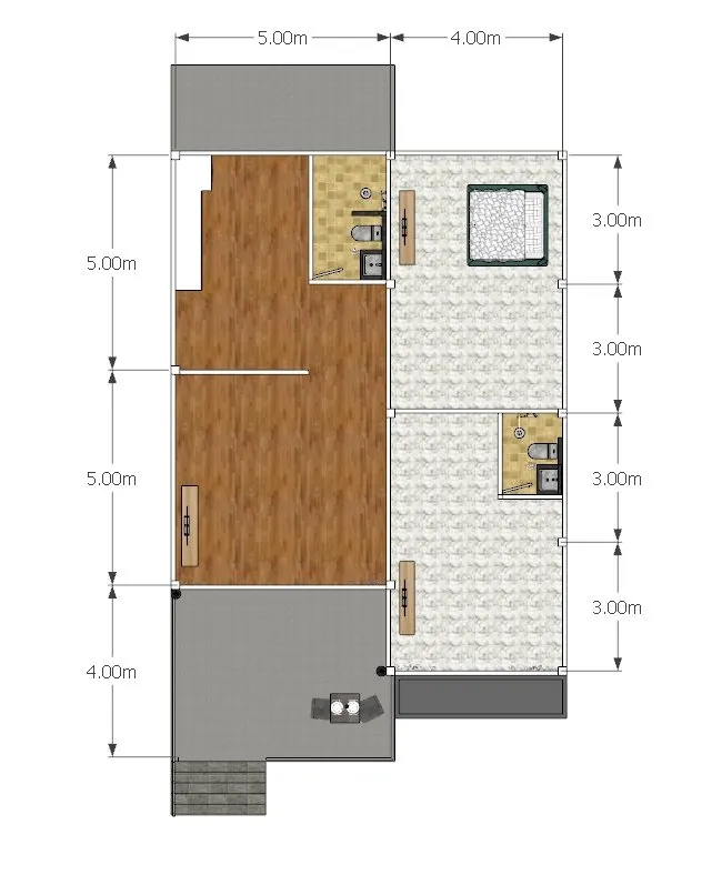 บ้านหลังนี้มีขนาด 2 ห้องนอน 2 ห้องน้ำ 1 ห้องรับแขก/โถง 1 ครัว และมีเฉลียงและระเบียงนั้งเล่นหน้าบ้าน พื้นที่ใช้สอยรวม 128 ตารางเมตร งบก่อสร้างอยู่ที่ราว 1.1-1.3 ล้านบาท ขึ้นอยู่กับการเลือกวัสดุและค่าแรงก่อสร้างในแต่ละท้องถิ่นด้วยครับ