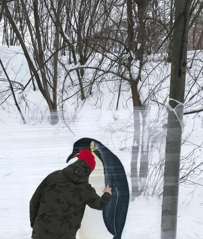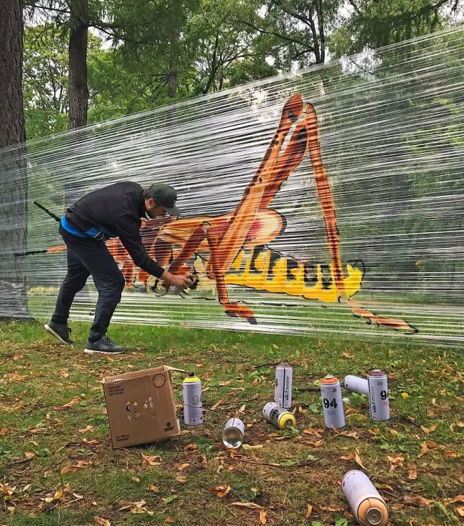 แต่มันก็มีงานอีกรูปแบบหนึ่งที่ดูแตกต่างที่เราไม่ค่อยเห็นที่ไหนมาก่อน อย่างเช่นการวาดภาพลงบนพลาสติกใส ซึ่ง Evgeny ได้วาดภาพศิลปะสไตล์กราฟฟิตีลงบนแผ่นพลาสติกใสๆ เมื่อประมาณ 8 ปีก่อนในป่า เป็นการทดลองที่จะเปลี่ยนจากศิลปะเมืองไปสู่ภูมิทัศน์ธรรมชาติ “ฉันเรียกเทคนิค Cellogra Graffiti ของฉัน มันเป็นวิธีที่ง่ายในการทาสีในสถานที่ที่คุณไม่มีกำแพงและทำได้ภายใน 2 นาที!” Evgeny กล่าว