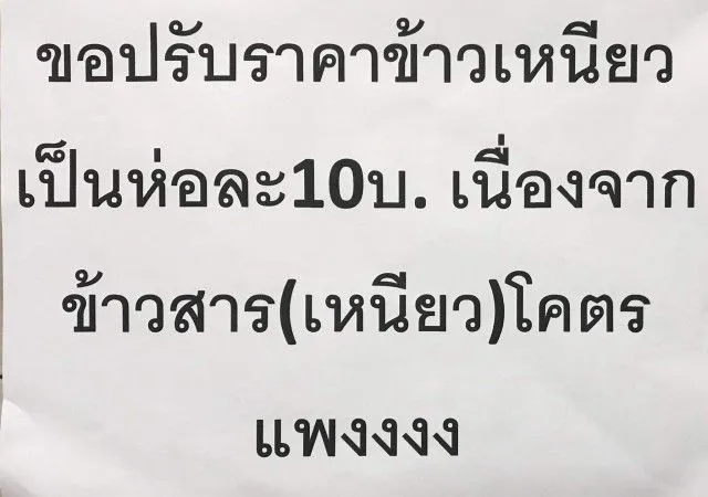 พ่อค้า แม่ค้า ขายข้าวเหนียวหมูปิ้ง บอกว่า วันจันทร์ที่5ส.ค.62 ขอขึ้นราคาข้าวเหนียวห่อละ5บาท เป็น10บาท"