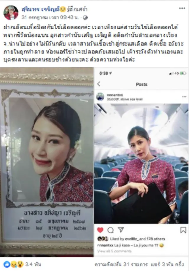 31 กรกฎาคม 2562 เฟสสบุ๊ค สุรินทร เจริญดี ได้โพสต์เรื่องของสาวแอร์โฮสเตสที่เสียชีวิตเพราะไข้เลือดออกโดยได้ระบุว่า