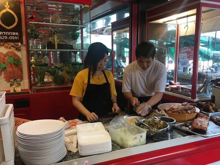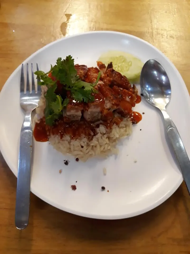 เมนูของร้านแห่งนี้ มีทั้ง ข้าวหมูกรอบ-หมูแดง, ข้าวหมูกรอบ-ขาหมู, ข้าวหมูกรอบ-ไก่อบ, ข้าวขาหมู, ข้าวไก่อบ และคากิ ส่วนเมนูเด็ด-แนะนำก็คือ ข้าวขาหมู-หมูกรอบ ที่เสิร์ฟพร้อมกับต้นหอมผักชีและผักกาดหอม ตบท้ายด้วยน้ำจิ้มสูตรเด็ดของทางร้าน ซึ่งหมูกรอบนั้นเนื้อกรอบนุ่ม เนื้อขาหมูเปื่อยกำลังดี ทั้งสองอย่างนี้ทานเข้ากันกับน้ำจิ้มที่มีรสชาติเผ็ดหวาน ใครที่ได้มาลองกินจึงติดใจกันทุกราย ราคาขายทุกจานอยู่ที่ 50 บาท ยกเว้น ข้าวคากิที่ราคา 80 บาท
