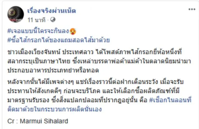 ทุกวันนี้จะซื้ออะไรก็ต้องดูดีๆไม่ว่าจะเป็นบิลใบเสร็จรับเงิน ที่ต้องตรวจว่าถูกต้องหรือไม่ แล้วของที่เราซื้อมาสะอาดถูกสุขลักษณะหรือเปล่า วันนี้เรามีเรื่องราวที่มีการแชร์ต่อๆกันไปเป็นจำนวนมาก เมื่อหญิงสาวรายหนึ่งได้ซื้ออาหารมาทานปรากฏว่าได้ของแถมกลับมาด้วย เมื่อวันที่ 30 เพจเรื่องจริงผ่านเน็ต ได้โพสต์ภาพพร้อมระบุข้อความว่า เจอแบบนี้ใครจะกินลง ได้ของแถมมาด้วย ชาวเมืองเวียงจันทน์ ประเทศลาว ได้โพสต์ภาพอาหารยี่ห้อหนึ่งที่สลากระบุเป็นภาษาไทย ซึ่งเหล่าบรรดาพ่อค้าแม่ค้าในตลาดนิยมนำมาประกอบอาหารประเภทยำหรือทอด หลังจากนั้นได้มีเพจต่างๆ แชร์เรื่องราวนี้ต่อฝากเตือนระวัง เมื่อจะรับประทานให้สังเกตดีๆ ก่อนจะบริโภค และให้เลือกซื้อผลิตภัณฑ์ที่มีมาตรฐานรับรอง ซึ่งสิ่งแปลกปลอมที่ปรากฎอยู่นั้น คือ เชือกไนลอนที่ติดมาด้วยในกระบวนการผลิตนั่นเอง