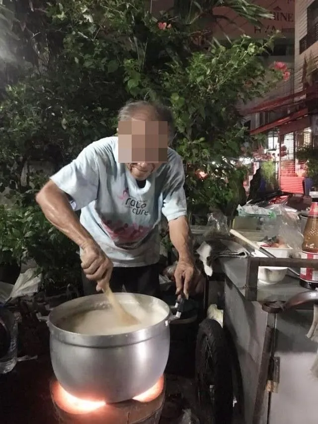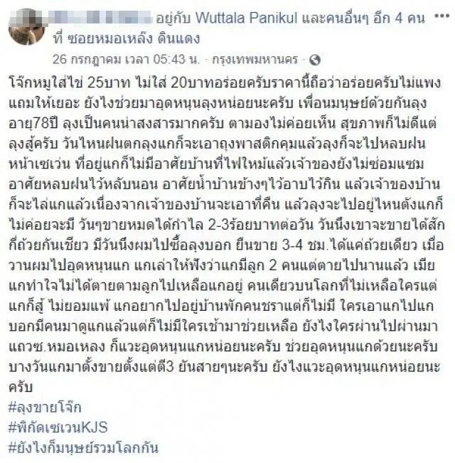 “โจ๊กหมูใส่ไข่ 25 บาท ไม่ใส่ 20 บาทอร่อยครับ ราคานี้ถือว่าอร่อยครับไม่แพงแถมให้เยอะ ยังไงช่วยมาอุดหนุนลุงหน่อยนะครับ เพื่อนมนุษย์ด้วยกันลุงอายุ 78 ปี ลุงเป็นคนน่าสงสารมากครับ ตามองไม่ค่อยเห็น สุขภาพก็ไม่ดีแต่ลุงสู้ครับ วันไหนฝนตกลุงแกก็จะเอาถุงพาสติกคุมแล้วลุงก็จะไปหลบฝนหน้าเซเว่น ที่อยู่แกก็ไม่มีอาศัยบ้านที่ไฟไหม้แล้วเจ้าของยังไม่ซ่อมแซมอาศัยหลบฝนไว้หลับนอน อาศัยน้ำบ้านข้างๆไว้อาบไว้กิน แล้วเจ้าของบ้านก็จะไล่แกแล้วเนื่องจากเจ้าของบ้านจะเอาที่คืน แล้วลุงจะไปอยู่ไหนตังแกก็ไม่ค่อยจะมี วันๆขายหมดได้กำไล 2-3 ร้อยบาทต่อวัน”