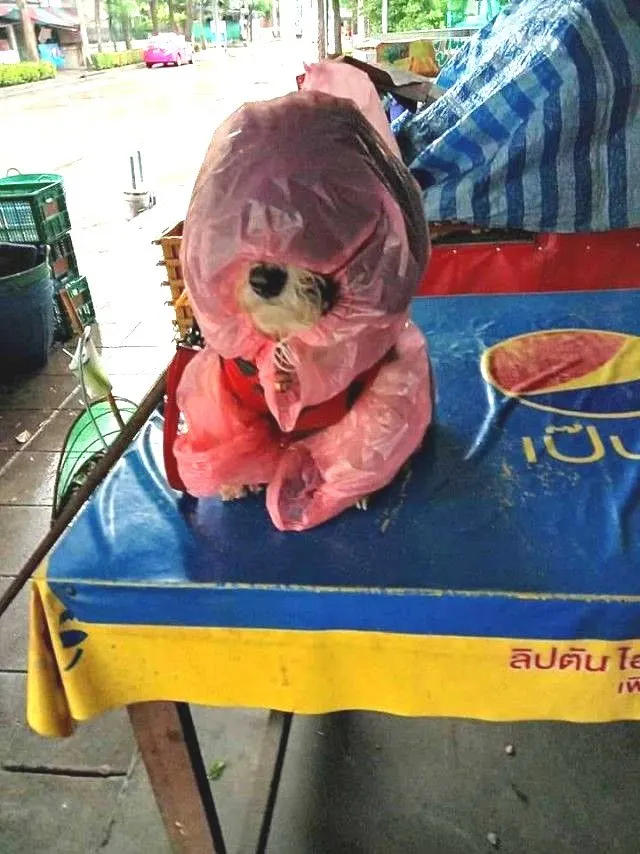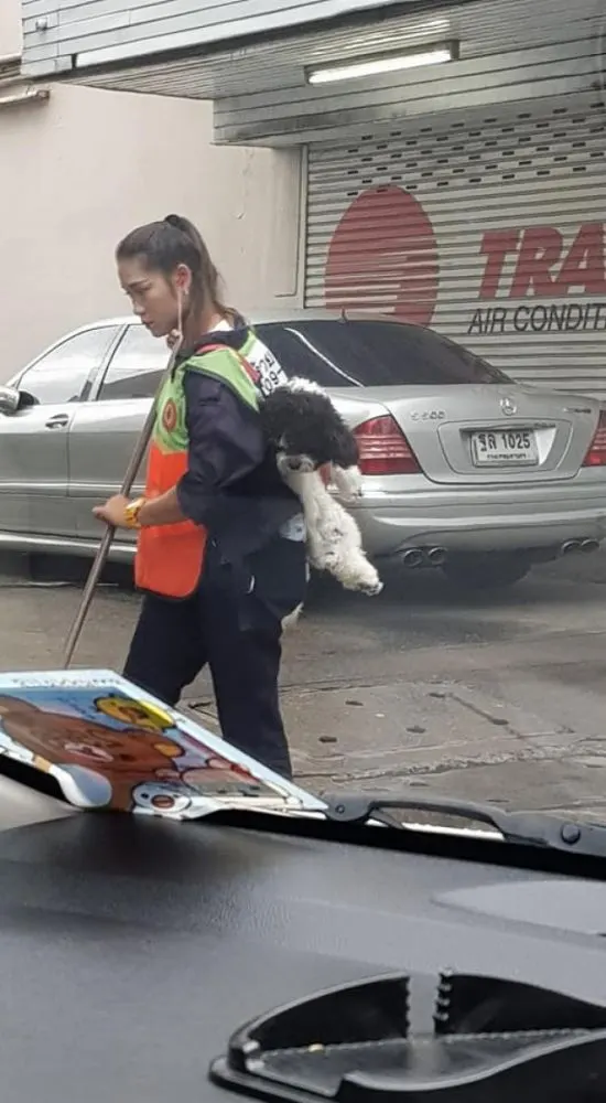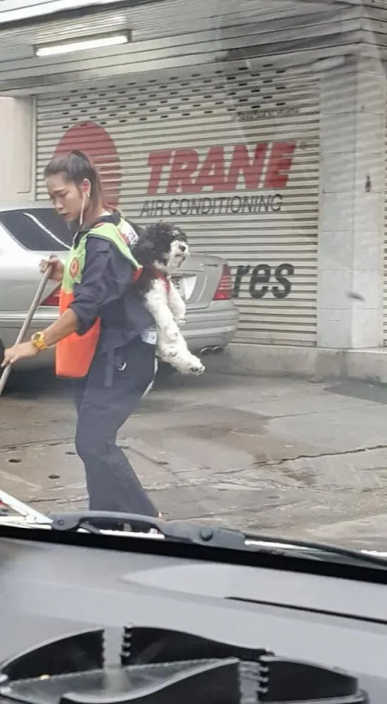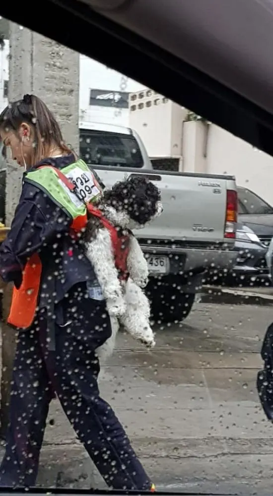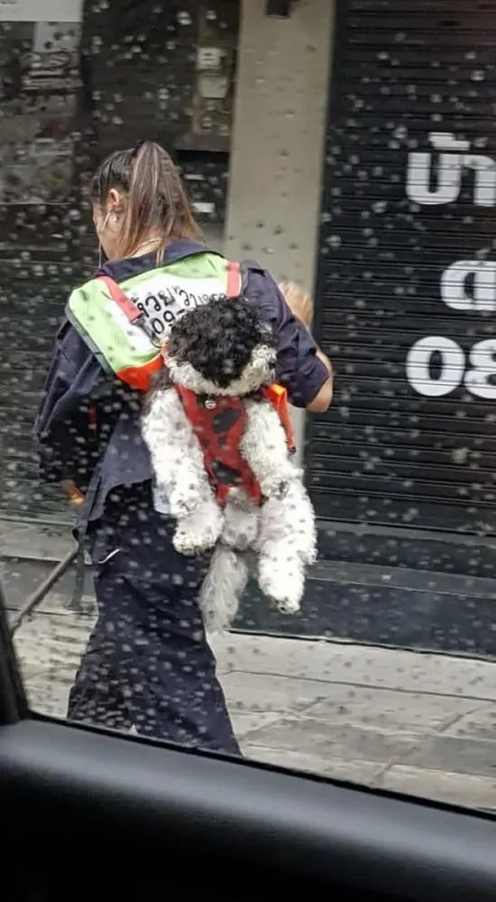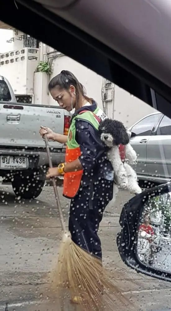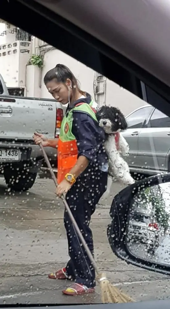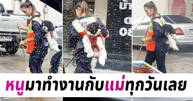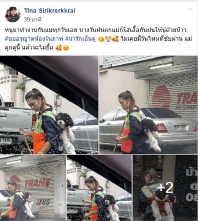 เป็นเรื่องราวที่น่ารักมากๆอีกเรื่องราวหนึ่งเมื่อมี ผู้ใช้เฟสบุ๊ครายหนึ่งใช้ชื่อว่า Tina Sirikrerkkraiได้โพสต์ภาพของสาวคนหนึ่ง ได้พาน้องหมามาทำงานด้วย และกำลังปฏิบัติหน้าที่ทั้งที่ฝนก็ตก และก็เอาน้องหมาสะพายใส่หลังเพราะคงกลัวว่าน้องหมาจะวิ่งซุกซน แล้วน้องหมาก็มองดูเจ้าของทำงานอย่างสงสัย แต่น้องก็ไม่มีอาการว่าจะขัดขืนแต่อย่างใด และอยู่นิ่งๆไม่ดื้อ โดยเจ้าของเฟสบุ๊ค Tina Sirikrerkkraiได้โพสต์ภาพพร้อมระบุข้อความว่า หนูมาทำงานกับแม่ทุกวันเลย บางวันฝนตกแม่ก็ใส่เสื้อกันฝนให้นู๋ด้วยน๊าา ขออนุญาตน้องในภาพ น่ารักเอ็นดู ไม่เคยมีวันไหนที่ขับผ่าน แม่ลูกคู่นี้ แล้วจะไม่ยิ้ม