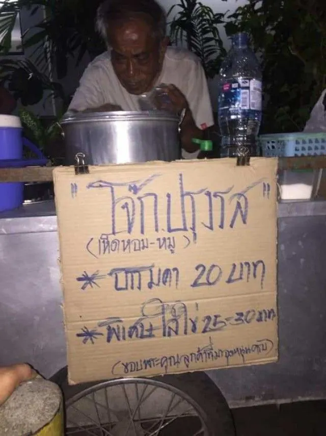 “โจ๊กหมูใส่ไข่ 25 บาท ไม่ใส่ 20 บาทอร่อยครับ ราคานี้ถือว่าอร่อยครับไม่แพงแถมให้เยอะ ยังไงช่วยมาอุดหนุนลุงหน่อยนะครับ เพื่อนมนุษย์ด้วยกันลุงอายุ 78 ปี ลุงเป็นคนน่าสงสารมากครับ ตามองไม่ค่อยเห็น สุขภาพก็ไม่ดีแต่ลุงสู้ครับ”“วันไหนฝนตกลุงแกก็จะเอาถุงพาสติกคุมแล้วลุงก็จะไปหลบฝนหน้าเซเว่น ที่อยู่แกก็ไม่มีอาศัยบ้านที่ไฟไหม้แล้วเจ้าของยังไม่ซ่อมแซมอาศัยหลบฝนไว้หลับนอน อาศัยน้ำบ้านข้างๆไว้อาบไว้กิน แล้วเจ้าของบ้านก็จะไล่แกแล้วเนื่องจากเจ้าของบ้านจะเอาที่คืน แล้วลุงจะไปอยู่ไหนตังแกก็ไม่ค่อยจะมี วันๆขายหมดได้กำไล 2-3 ร้อยบาทต่อวัน”