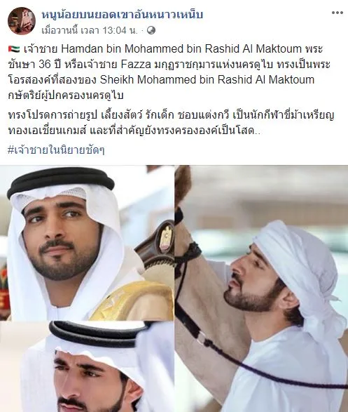 เจ้าชาย Hamdan bin Mohammed bin Rashid Al Maktoum มกุฏราชกุมารแห่งนครดูไบแล้ว พระองค์ทรงเป็นเจ้าชายรูปงาม ที่ชอบท่องเที่ยว ถ่ายภาพ และยังทรงชอบช่วยเหลือผู้อื่น ทรงให้ความสนพระทัยเรื่องคุณภาพชีวิตของผู้พิการและผู้ด้อยโอกาสในสังคม อีกด้วย เรียกว่านอกจากจะทรงรูปงามแล้ว พระองค์ยังมีพระเมตตาอีกด้วย