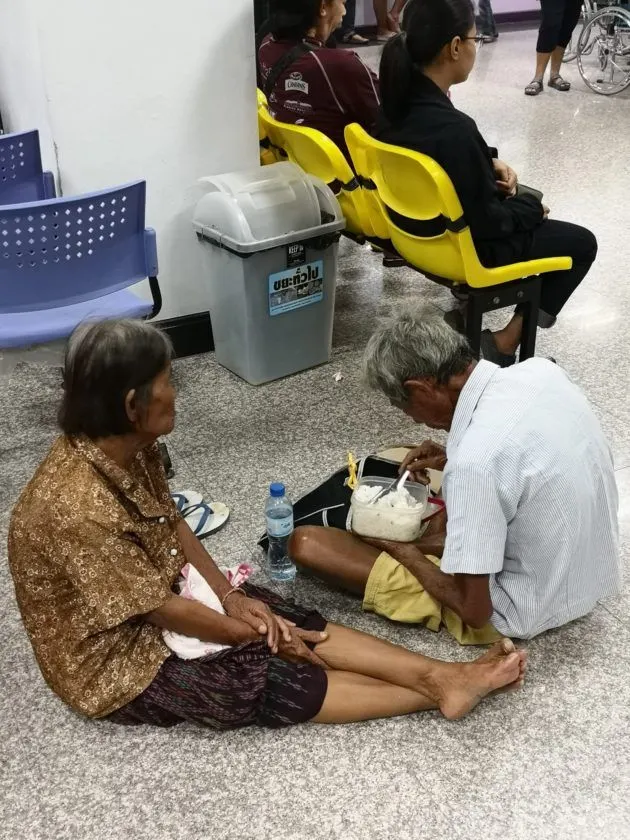 วันที่ 6 สิงหาคม 2562 ผู้ใช้เฟซบุ๊กชื่อคุณ Pronpimon Yamnail ได้เผยเรื่องราวของตายายคู่หนึ่งที่พากันมาหาหมอที่โรงพยาบาลโดยเจ้าตัวได้ระบุข้อความว่า “วันนี้มีเรื่องราวมาเล่าให้ฟังรอระหว่างการนั่งรอตรวจก่อนอื่นคุณเห็นภาพนี้แล้วรู้สึกอย่างไรแอมบอกเลยว่าเห็นครั้งแรกแล้วหดหู่ใจมากทีแรกเลยเดินผ่านเห็นตายายคู่นึงนั่งอยู่กับพื้นก็เลยมองดูเห็นตาเอาข้าวออกมาจากกระเป๋าพร้อมขวดน้ำเราก็เลยยืนมองดูว่าตากินข้าวกะอะไรคือตากินข้าวเปล่าที่ห่อมาจากบ้านโดยไม่มีกลับข้าวเลยในกล่องข้าวมีช้อน 2 อัน เพื่อยายกินด้วยเรายืนมองอยู่พักนึงว่าแกว่ากับใครมาด้วยไหมมีลูกมาหรือป่าวแต่ก็ไม่มีใครเลยมากัน 2 คนเลยเดินเข้าไปถามยายมากับใครมีญาติมาด้วยไหมยายบอกมากับตา 2 คนเลยถามว่าบ้านยายอยู่ไหนยายบอกว่าบ้านยายอยู่ อ.คง ขึ้นรถทัวร์มาลงบขส. แล้วนั่งรถ 2 แถวต่อมาโรงพยาบาลมากันค่ารถ 2 คนร้อยกว่าบาทยายอายุ 78 ส่วนตาอายุ 75 ยายเป็นนิ่วส่วนตาไม่ได้เป็นอะไรมาเป็นเพื่อนยายยายบอกยายมีลูก 1 คน เขามีครอบครัวแยกกันไปแล้วมาดูแลบ้างแต่ไม่ได้ส่งเสียอะไรเลยถามต่อว่ายายเอาเงินไหนมายายบอกยืมเขามา 300 บาท พอเงินเดือนคนแก่ออกก็จะไปคืนเขาไม่ได้มีรายได้อะไรหมอนัดก่อนเงินเดือนออกเลยต้องยืมเขาเราก็ได้ให้ค่ารถแกไป200 แล้วบอกแกว่ายายอันนี้หนูตั้งใจให้เอาไว้เป็นค่ารถกลับบ้านนะค่ะหนูไม่ได้มีเงินมากอะไรแต่ตั้งใจที่จะให้ยายยกมือไว้พร้อมน้ำตาและให้พร****