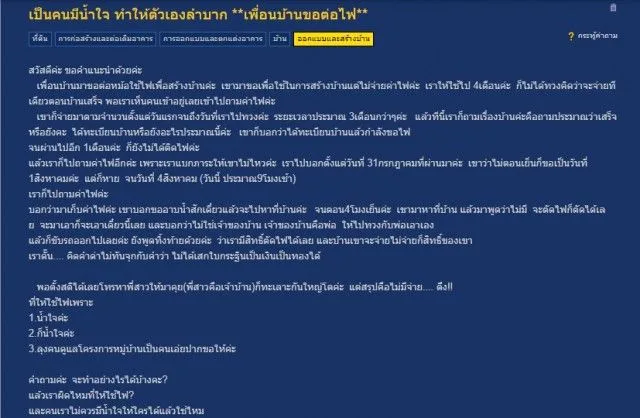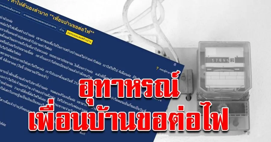พร้อมเล่าเหตุการณ์ที่เกิดขึ้นว่า เพื่อนบ้านของตนเองได้เข้ามาขอร่วมใช้ไฟจากบ้านของผู้โพสต์ด้วยระยะหนึ่ง เนื่องจากต้องใช้ไฟในการสร้างบ้าน ผ่านไปกว่า 3 เดือน พบว่ามีคนเข้ามาอยู่จึงเดินเข้าไปทวงค่าไฟ สุดท้ายจึงได้เงินค่าไฟมา และสอบถามความคีบหน้าของการสร้างบ้าน ทราบว่าขณะนี้ได้ทะเบียนบ้านแล้วและกำลังขอไฟฟ้า