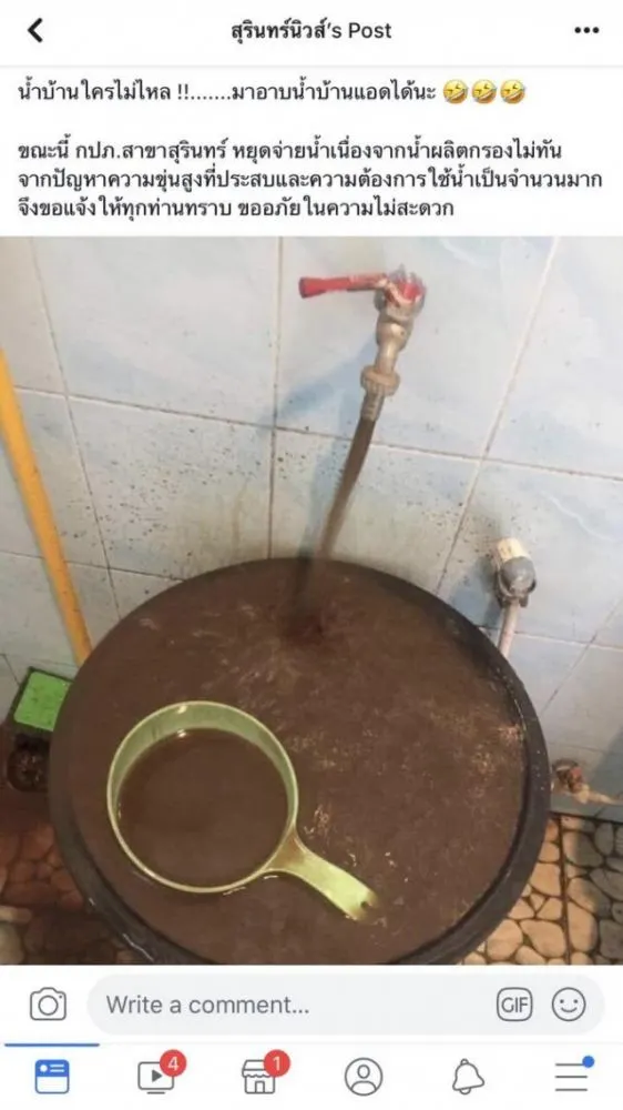 กลายเป็นประเด็นขึ้นมาทันที เมื่อโลกออนไลน์ ได้มีการโพสต์รูปภาพน้ำประปาในจังหวัดสุรินทร์ ที่มีสีขุ่น คล้ายสีน้ำปลาร้า ไม่สามารถนำมาใช้อุปโภคบริโภคได้
