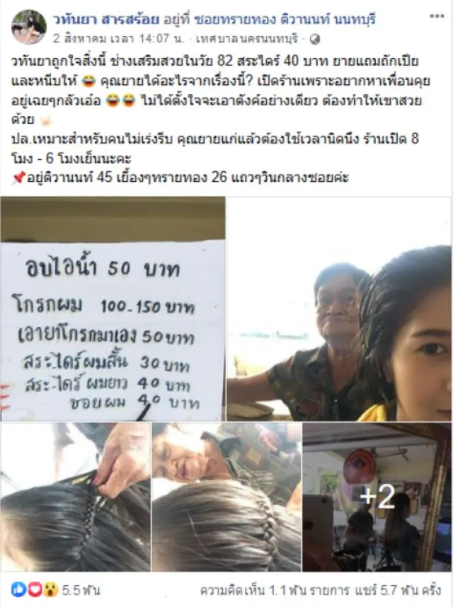 โดยมีข้อความว่า "วทันยาถูกใจสิ่งนี้ ช่างเสริมสวยในวัย 82 สระไดร์ 40 บาท ยายแถมถักเปียและหนีบให้ คุณยายได้อะไรจากเรื่องนี้? เปิดร้านเพราะอยากหาเพื่อนคุย อยู่เฉยๆกลัวเอ๋อ ไม่ได้ตั้งใจจะเอาตังค์อย่างเดียว ต้องทำให้เขาสวยด้วย ปล.เหมาะสำหรับคนไม่เร่งรีบ คุณยายแก่แล้วต้องใช้เวลานิดนึง ร้านเปิด 8 โมง - 6 โมงเย็นนะคะ อยู่ติวานนท์ 45 เยี้องๆทรายทอง 26 แถวๆวินกลางซอยค่ะ"