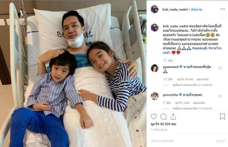 จากนั้นยังโพสต์ถึงการผ่าตัดครั้งนี้ด้วยว่า พ่อบรู๊คผ่าตัดก้อนเนื้อที่ต่อมไทรอยด์นะคะ ได้กำลังใจดีจากทั้งครอบครัว โดยเฉพาะ2แสบนี้ค่ะ ยังเจ็บมากและพูดลำบากนะคะ ขอบคุณทุกคนที่เป็นห่วง และขอบคุณทุกๆคำอวยพรด้วยนะคะ คุณพ่อสู้ๆ หายไวๆนะค้า”