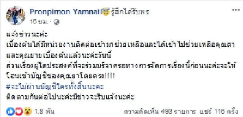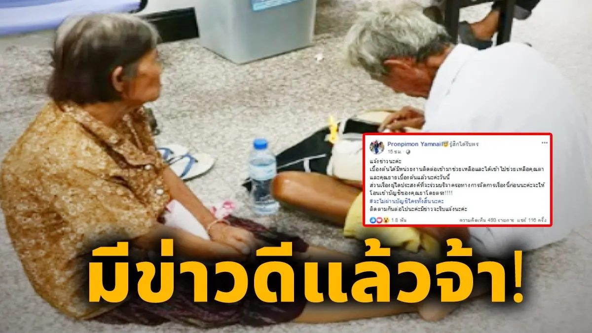 ล่าสุดมีข่าวดี มีคนจจะช่วยเหลือคุณตา คุณยายแล้ว โดยเฟสบุ๊คเจ้าของเรื่องได้โพสต์ต่ออีกว่า แจ้งข่าวนะค่ะ เบื้องต้นได้มีหน่วยงานติดต่อเข้ามาช่วยเหลือและได้เข้าไปช่วยเหลือคุณตาและคุณยายเบื้องต้นแล้วนะค่ะวันนี้ ส่วนเรื่องผู้ใดประสงค์ที่จะร่วมบริจาครอทางการจัดการเรื่องนี้ก่อนนะค่ะจะให้โอนเข้าบัญชีของคุณยาโดยตรง!!!!/hashtag/จะไม่ผ่านบัญชีใครทั้งสิ้นนะคะ? จะไม่ผ่านบัญชีใครทั้งสิ้นนะคะ ติดตามกันต่อไปนะค่ะมีข่าวจะรีบแจ้งนะค่ะ