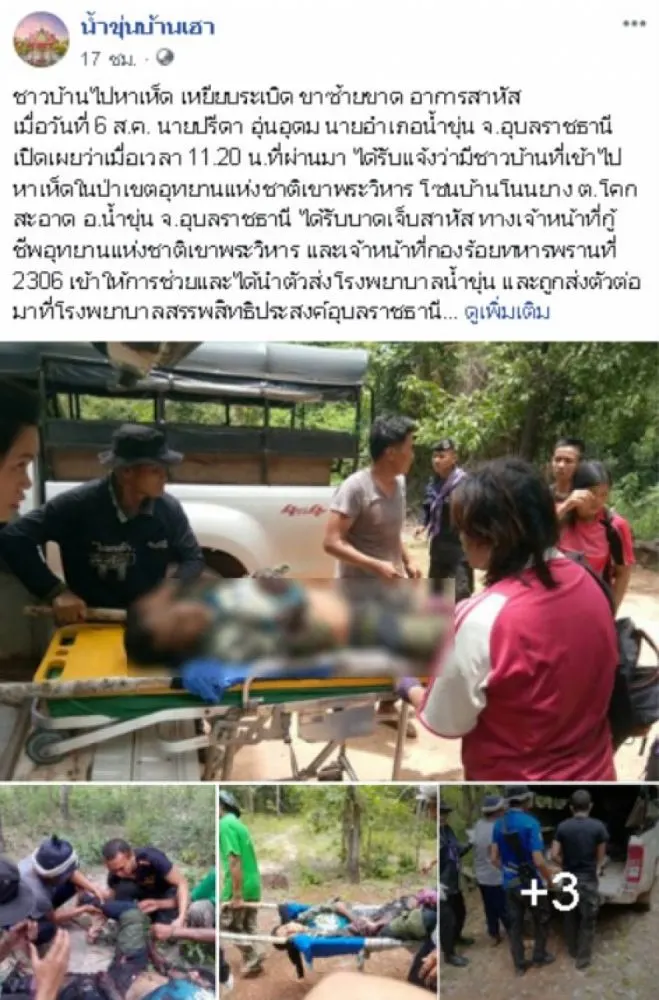 วันที่ 7 สิงหาคม เพจผู้ใช้เฟซบุ๊กชื่อ น้ำขุ่นบ้านเฮา ได้โพสต์ข้อความ พร้อมรูปภาพ ชาวบ้านไปหาเห็ด เหยียบระเบิด ขาซ้ายขาด อาการสาหัส ระบุว่า เมื่อวันที่ 6 ส.ค. นายปรีดา อุ่นอุดม นายอำเภอน้ำขุ่น จ.อุบลราชธานี เปิดเผยว่าเมื่อเวลา 11.20 น.ที่ผ่านมา ได้รับแจ้งว่ามีชาวบ้านที่เข้าไปหาเห็ดในป่าเขตอุทยานแห่งชาติเขาพระวิหาร โซนบ้านโนนยาง ต.โคกสะอาด อ.น้ำขุ่น จ.อุบลราชธานี ได้รับบาดเจ็บสาหัส ทางเจ้าหน้าที่กู้ชีพอุทยานแห่งชาติเขาพระวิหาร และเจ้าหน้าที่กองร้อยทหารพรานที่ 2306 เข้าให้การช่วยและได้นำตัวส่งโรงพยาบาลน้ำขุ่น และถูกส่งตัวต่อมาที่โรงพยาบาลสรรพสิทธิประสงค์อุบลราชธานี ทราบชื่อผู้ได้รับบาดเจ็บคือนายชัยยนต์ ทากะเมียด อายุ 35 ปี อยู่บ้านเลขที่ 32 บ้านหมากแหน่ง ม.4 ต.ตาเกา อ.น้ำขุ่น จ.อุบลราชธานี สภาพขาด้านซ้ายใต้เข่าลงมาขาด มีบาดแผลที่บริเวณแขนบางส่วน และบริเวณง่ามขา ได้รับบาดเจ็บสาหัส ยังมีสติพูดคุยได้