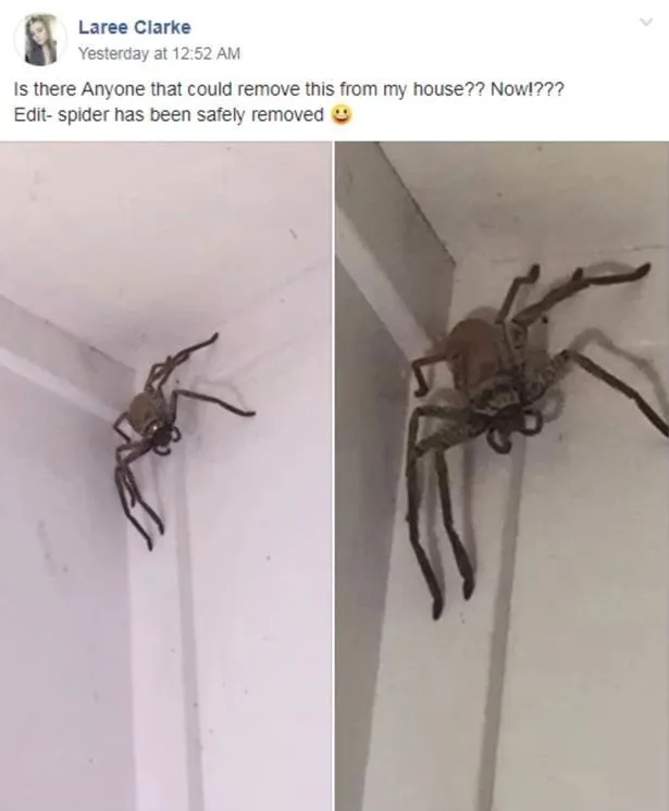Laree Clarke สาวชาวออสเตรเลียที่อาศัยอยู่ในรัฐควีนส์แลนด์คนนี้ เธอเดินทางกลับมาถึงบ้านในช่วงบ่ายๆ เมื่อเดินเข้าบ้านไป เธอก็เหลือบไปเห็นอะไรที่ทำให้เธอต้องสะพรึ่ง เพราะมันคือแมงมุมยักษ์ตัวใหญ่ที่เกาะอยู่ตรงเพดานในตัวบ้าน เธอจึงรีบถ่ายรูปของมันและโพสลงเฟสบุ๊กเพื่อขอความช่วยเหลือในการไล่แมงมุมนักล่ายักษ์ มีใครที่สามารถเอาสิ่งนี้ออกไปจากบ้านของฉันได้หรือไม่?ในตอนนี้เลย! ???” Laree โพสต์พร้อมรูปภาพผู้บุกรุกแปดขาในเฟซบุ๊กในกลุ่มของเธอ เธออธิบายต่อว่ามันมีขนาดใหญ่มากและเธอไม่มีภาชนะขนาดใหญ่พอที่จะจับมันได้