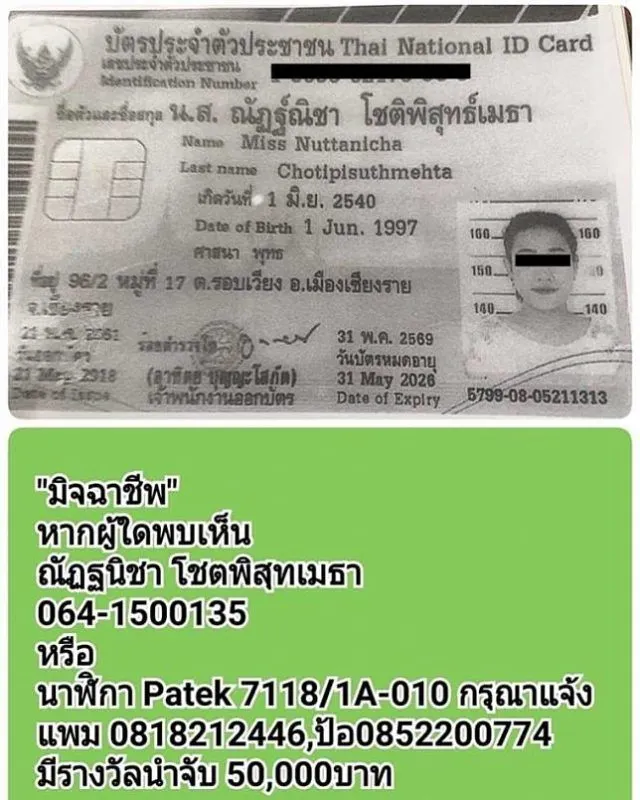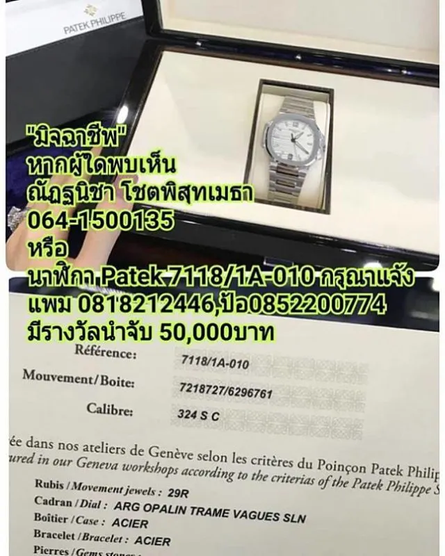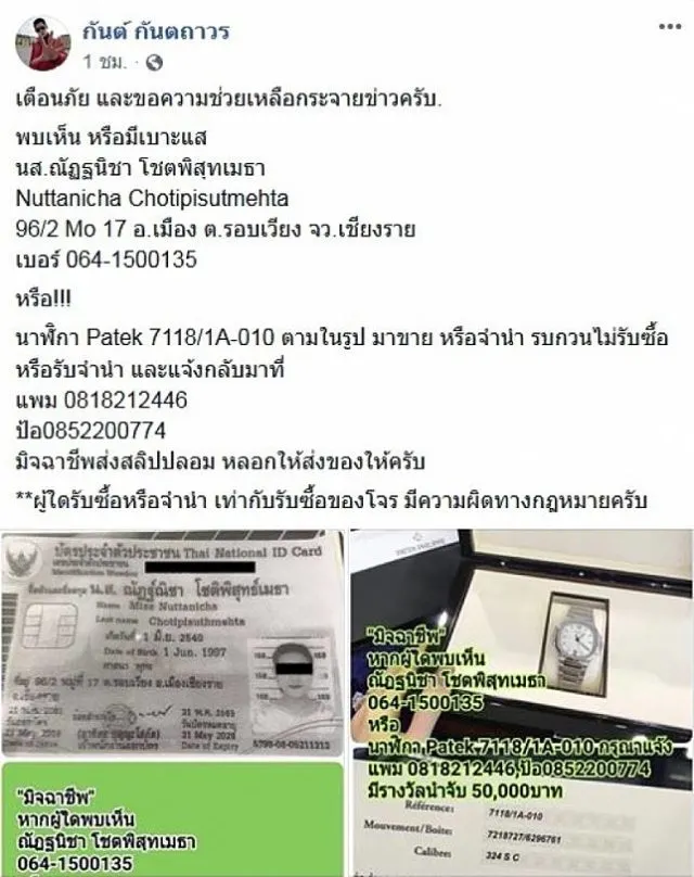 นส.ณัฏฐนิชา โชตพิสุทเมธา Nuttanicha Chotipisutmehta 96/2 Mo 17 อ.เมือง ต.รอบเวียง จว.เชียงราย เบอร์ 064-1500135 หรือ!!! นาฬิกา Patek 7118/1A-010 ตามในรูป มาขาย หรือจำนำ รบกวนไม่รับซื้อ หรือรับจำนำ และแจ้งกลับมาที่ แพม 081-8212446, ป้อ 085-2200774 มิจฉาชีwส่งสลิปปลอม หລอกให้ส่งของให้ครับ **ผู้ใดรับซื้อหรือจำนำ เท่ากับรับซื้อของโจs มีความผิดทางกฎหมายครับ” ซึ่งภายในรูปที่หนุ่มกันต์โพสต์นั้น ระบุไว้อีกด้วยว่า มีรางวัลนำจับ 50,000 บาท ซึ่งหากใครพบเบาะแสตามชื่อและและอยู่บุคคลในภาพ ก็สามารถติดต่อไปทางเจ้าของได้เลย