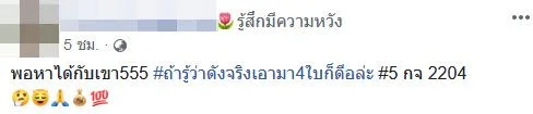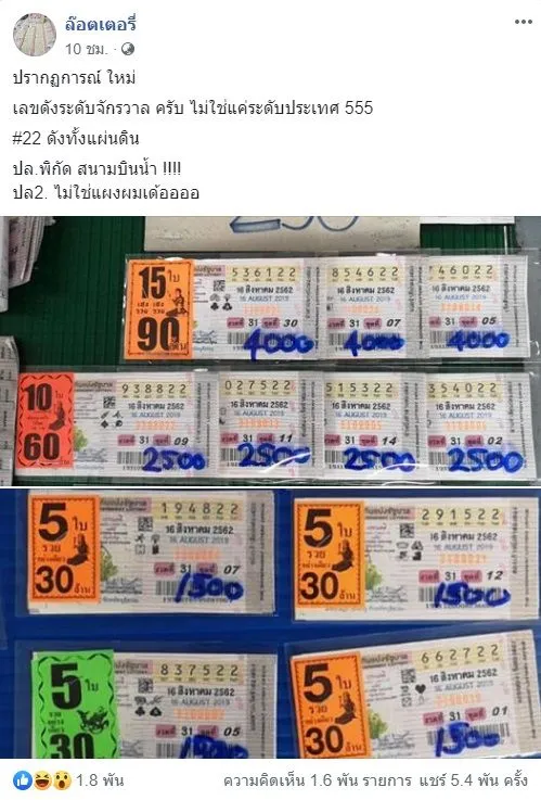 ล่าสุดในเพจ ล๊อตเตอรี่ โพสต์ข้อความระบุว่า ปรากฏการณ์ ใหม่เลขดังระดับจักรวาล ครับ ไม่ใช่แค่ระดับประเทศ 555#22 ดังทั้งแผ่นดิน ปล.พิกัด สนามบินน้ำ !!!! ปล2. ไม่ใช่แผงผมเด้ออออ