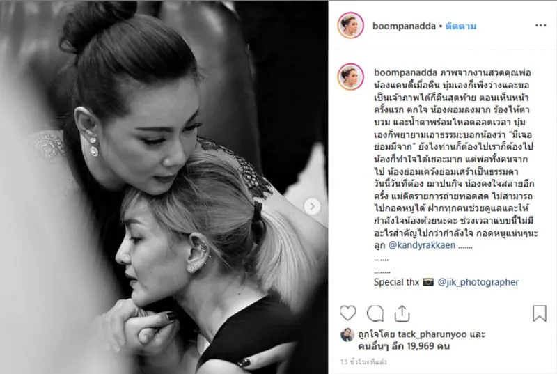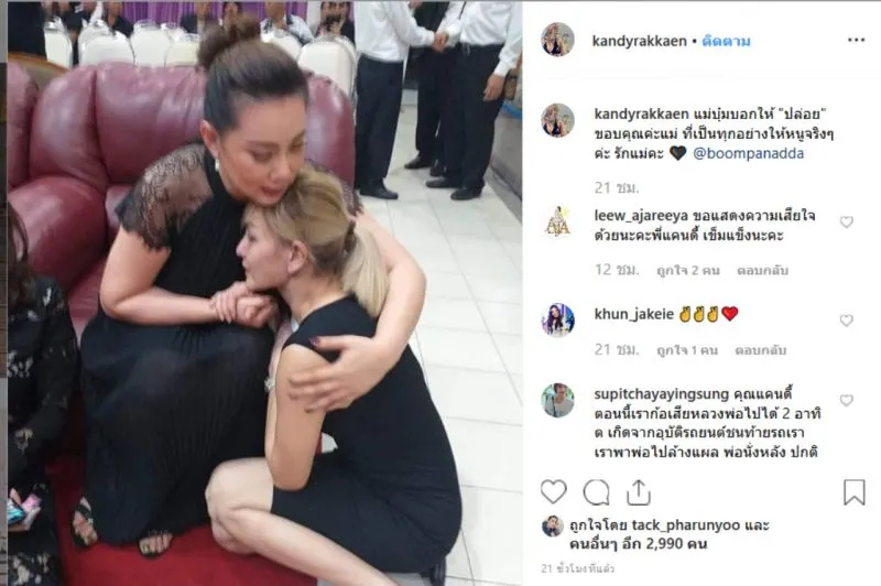 ซึ่งทาง บุ๋ม ปนัดดา ได้ขอเป็นเจ้าภาพ งานสวดอภิธรรมในวันสุดท้าย และยังได้เผยภาพบรรยากาศ พร้อมเล่าความรู้สึก นาทีที่เธอได้เดินเข้าไปสวมกอด ปลอบประโลมสาวแคนดี้ ว่า ภาพจากงานสวดคุณพ่อน้องแคนดี้เมื่อคืน บุ๋มเองก็เพิ่งว่างและขอเป็นเจ้าภาพได้ก็คืนสุดท้าย ตอนเห็นหน้าครั้งแรก ตกใจ น้องผอมลงมาก ร้องไห้ตาบวม และน้ำตาพร้อมไหลตลอดเวลา บุ๋มเองก็พยายามเอาธรรมะบอกน้องว่า “มีเจอย่อมมีจาก” ยังไงท่านก็ต้องไปเราก็ต้องไป น้องก็ทำใจได้เยอะมาก แต่พ่อทั้งคนจากไป น้องย่อมเคว้งย่อมเศร้าเป็นธรรมดา วันนี้วันที่ต้อง ฌาปนกิจ น้องคงใจสลายอีกครั้ง แม่ติดรายการถ่ายทอดสด ไม่สามารถไปกอดหนูได้ ฝากทุกคนช่วยดูแลและให้กำลังใจน้องด้วยนะคะ ช่วงเวลาแบบนี้ไม่มีอะไรสำคัญไปกว่ากำลังใจ กอดหนูแน่นๆนะลูก