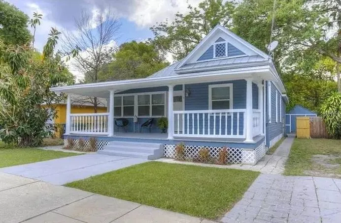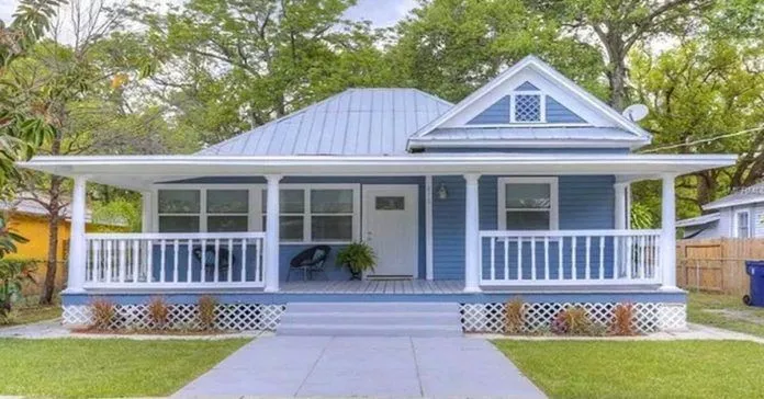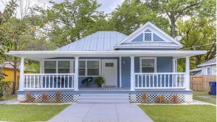 ไอเดียบ้านสวยแบบคอทเทจ สีฟ้าสดใส ดีไซน์สวยงาม ร่มรื่น ล้อมรอบด้วยต้นไม้