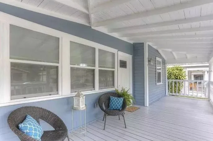 ส่วนของหน้าบ้าน เป็นระเบียงแบบกว้าง ตามพื้นที่หน้าบ้าน ทำให้มีพื้นที่ใช้สอยจำนวนมาก ทั้งสามารถใช้เป็น สถานที่รับแขก และนั่งคุยกันในครอบครัว ส่วนของระเบียงกั้นหน้าบ้าน ออกแบเป็นลูกกรงไม้แกะสลัก ดูสวยงามตามแบบ ย้อนยุคสมัย พื้นหน้าบ้านปูด้วยไม้ ทาด้วยสีขาว