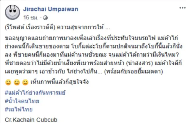 เป็นอีกหนึ่งเรื่องราวที่ทำเอาคนไทยทราบซึ้งเป็นอย่างมากกับเรื่องราวของแม่ค้าที่ขายของบนรถไฟ และขณะเดินขายสังเกตเห็นว่ามีชายคนหนึ่งนั่งมอง และมองอยู่นานมากๆ เรื่องราวดังกล่าวได้ถูกเผยแพร่โดยเพจ Jirachai Umpaiwan ได้โพสต์ข้อความระบุว่า (รีโพสต์ เรื่องราวดีดี) ความสุขจากการให้ ขออนุญาตแอบถ่ายภาพมาลงเพื่อเล่าเรื่องที่ประทับใจบนรถไฟ แม่ค้าไก่คนนี้ก็เดินขายของตาม โบกี้แต่ล่ะโบกี้ตามปกติจนมาถึงโบกี้นี้แล้วก็นั่งลง พี่ชายคนนี้ก็มองมาที่แม่ค้านานชั่วขณะ จนแม่ค้าได้ถามว่ามีเงินไหม พี่ชายตอบว่าไม่มีด้วยน้ำเสียงที่เบาพร้อมส่ายหน้า (น่าสงสาร) แม่ค้าใจดีก็เลยพูดว่ามาๆ เอาข้าวกับ ไก่ไปกิน(พร้อมกับรอยยิ้มเมตตา) เห็นภาพนี้แล้วก็สุขใจจัง #แม่ค้าไก่ย่างกันทรารมย์ น้ำใจคนไทย รถไฟไทย Cr.Kachain Cubcub