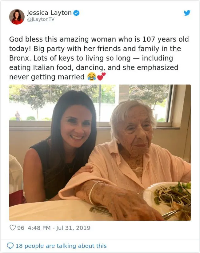 โชคดีสำหรับเราที่คุณทวดยังมีเคล็ดลับที่มีประโยชน์อื่นๆ เพื่อช่วยให้สุขภาพแข็งแรงและมีชีวิตยืนยาวขึ้น เธอกล่าวว่า “อาหารอิตาเลี่ยน อาหารอิตาเลี่ยนอร่อยมาก ฉันถูกเลี้ยงด้วยอาหารที่ดีมาก ไม่มีน้ำอัดลม ไม่มีเค้ก” เธอเปิดเผยกับสื่อและระบุว่าเธอยังคงทำงานอยู่ในศูนย์ชุมชน Bartow ใน Coop City ที่ปัจจุบันเธออาศัยอยู่ “ ถ้าพวกเขามีการออกกำลังกาย ฉันจะออกกำลังกาย หากพวกเขาเต้นรำ ฉันก็เต้นรำ และตอนนี้ฉันยังเต้นอยู่บ้าง หลังอาหารกลางวันฉันจะเล่นบิงโกดังนั้นฉันจึงมีเวลาเต็มวัน”