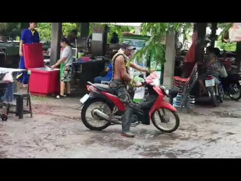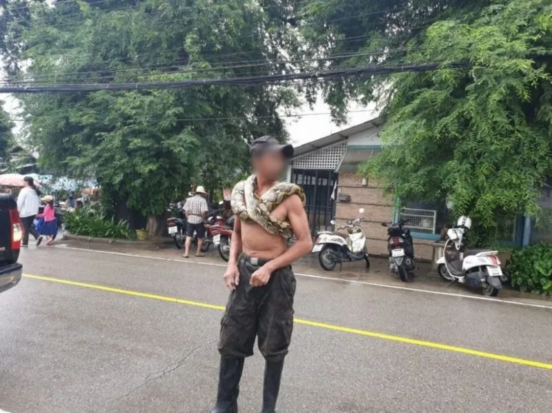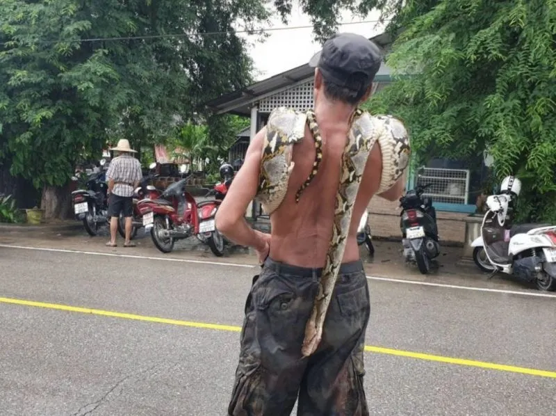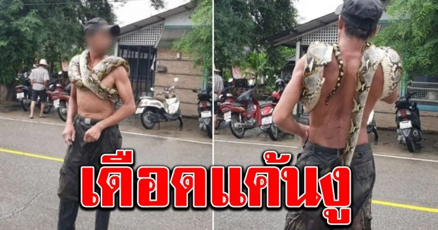 หนุ่มใหญ่แค้นงูเหลือมกินไก่ ห้อยงูพาดคอไปตลาด ชาวบ้านแตกตื่นวิ่งหนี