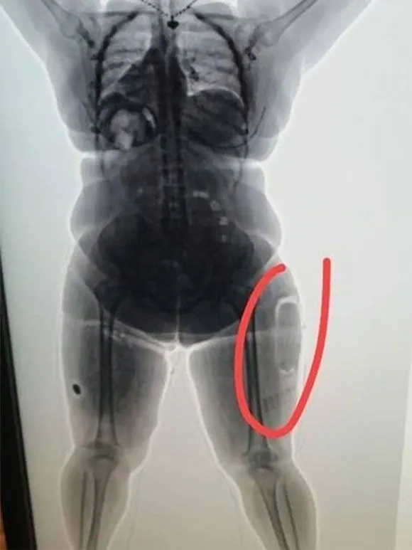 แต่ทางเจ้าหน้าที่สังเกตเห็นหญิงรายดังกล่าวเดินด้วยท่าทางเชื่องช้าและดูเจ็บปวด จึงนำตัวไปตรวจเช็กอย่างละเอียดที่สำนักงานตำรวจของสนามบิน ผลการสแกนร่างกายพบว่าที่บริเวณต้นขาด้านซ้ายของเธอมีร่องรอยเย็บปิดบาดแผลที่ผิดปกติ เมื่อส่งตัวไปให้แพทย์ที่โรงพยาบาลช่วยตรวจสอบ ผ่าต้นขาออกมาพบมีซองบรรจุสารโคเคนเหลวหนัก 780 กรัม แพทย์ระบุดูจากแผล คาดว่าเธอเป็นผู้เย็บปิดด้วยตัวเอง