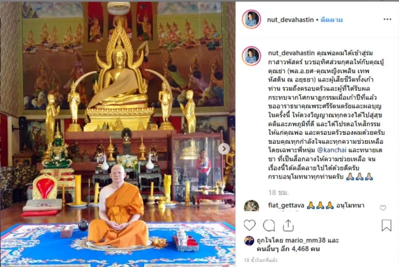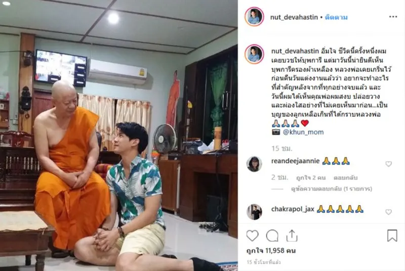 นอกจากนี้ ณัฏฐ์ ยังได้เผยภาพถ่ายคู่กับหลวงพ่อ พร้อมข้อความว่า อิ่มใจ ชีวิตนี้ครั้งหนึ่งผมเคยบวชให้บุพการี แต่มาวันนี้น่ายินดีเห็นบุพการีครองผ้าเหลือง หลวงพ่อเคยเกริ่นไว้ก่อนคืนวันแต่งงานแล้วว่า อยากจะทำอะไรที่สำคัญหลังจากที่ทุกอย่างจบแล้ว และวันนี้ผมได้เห็นคุณพ่อผมสงบ ปล่อยวาง และผ่องใสอย่างที่ไม่เคยเห็นมาก่อน...เป็นบุญของลูกเหลือเกินที่ได้กราบหลวงพ่อ