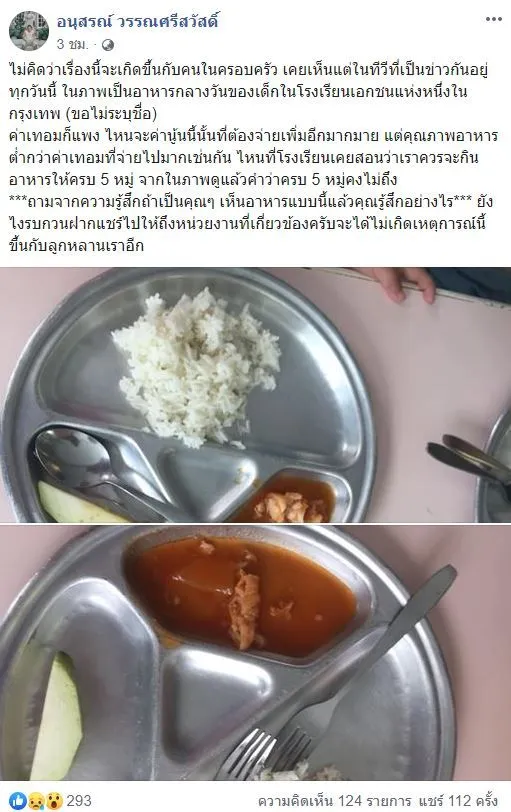 วันที่ 9 สิงหาคม 2562 สมาชิกเฟซบุ๊กชื่อว่า อนุสรณ์ วรรณศรีสวัสดิ์ โพสต์รูปภาพแฉเมนูมื้อกลางวันของโรงเรียนเอกชนแห่งหนึ่งในกรุงเทพฯ ซึ่งต้องบอกว่าปริมาณและคุณภาพเห็นแล้วถึงกับต้องกุมขมับ น่าเห็นใจลูกๆหลานๆของเราจริงๆ
