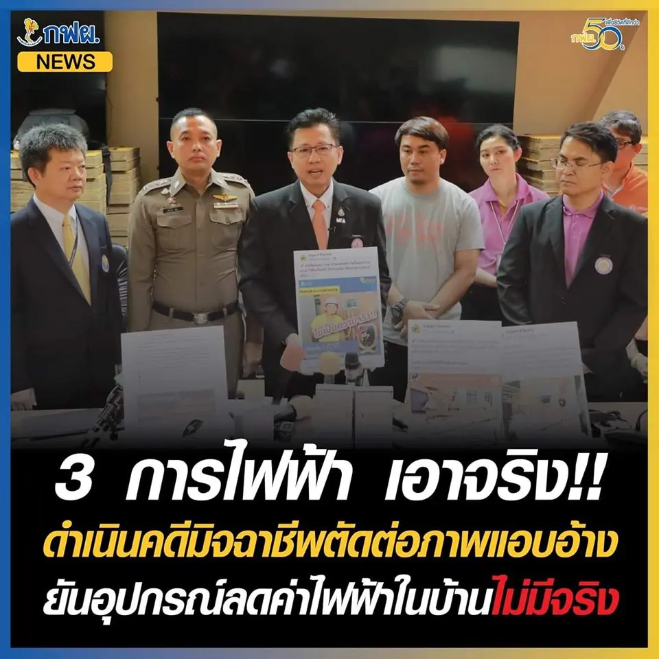 เอาจริง!! การไฟฟ้าฯ เตือนปชช. อุปกรณ์ลดค่าไฟฟ้าในบ้าน ไม่มีจริง!!! พร้อมเข้าแจ้งความดำเนินคดีมิจฉาชีพตัดต่อภาพแอบอ้าง หลอกขายอุปกรณ์