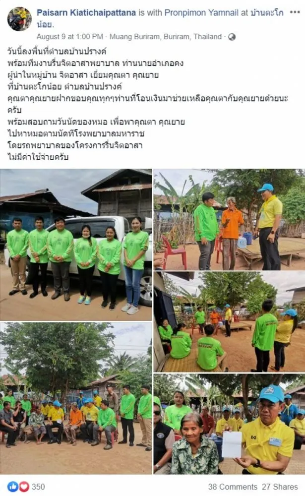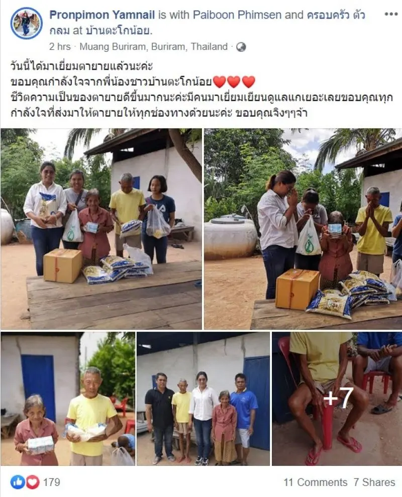 วันที่ 11 สิงหาคม 2562 ผู้สื่อข่าวรายงานความคืบหน้าของคุณตาและคุณยายจังหวัดนครราชสีมา ที่มาหาหมอ และนั่งกับพื้น นั่งกินข้าวเปล่าด้วยกัน 2 คน แบบไม่มีกับข้าว ผู้ที่พบเห็นต่างพากันนำตาซึม โดยผู้ใช้เฟซบุ๊กรายหนึ่งได้ช่วยกระจายข่าวของคุณตาคุณยายหวังกระแสช่วยเหลือ เพื่อให้ทั้งสองได้มีชีวิตที่ดีขึ้น ทราบชื่อต่อมาคือ คุณตาทองแดง ศรีทอง อายุ 75 ปี และ คุณยายสนั่น กระโจมทอง อายุ 78 ปี ซึ่งหลังจากที่เรื่องราวปรากฏเป็นข่าว หน่วยงานที่เกี่ยวข้องทั้งภาครัฐและเอกชน ได้เดินทางลงพื้นที่ช่วยเหลือแล้ว