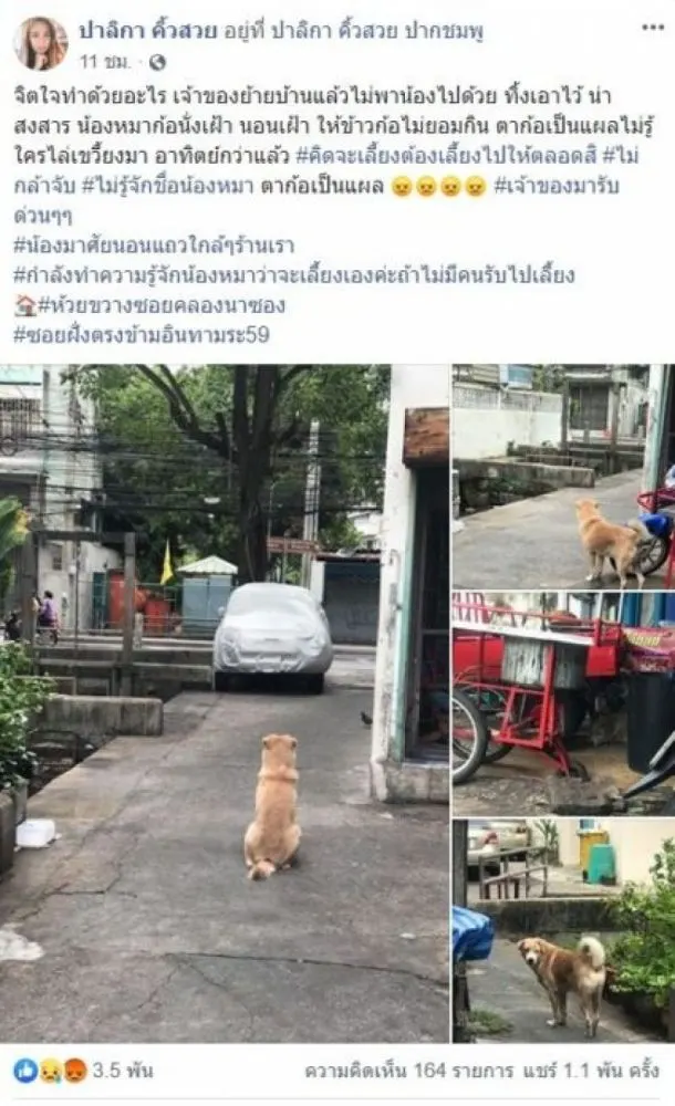 ไม่ว่าด้วยความจำเป็น หรือเหตุผลใดก็ตาม สุนัขที่ถูกทอดทิ้งจากเจ้านายที่เลี้ยงมันมาตั้งแต่ยังเล็ก ย่อมมีความผูกพันและซื่อสัตย์แค่นายของมันเท่านั้น เช่นเดียวกับเรื่องราวเมื่อวันที่ 11 ส.ค. สมาชิกเฟซบุ๊กชื่อ ปาลิกา คิ้วสวย โพสต์ภาพสุนัขตัวหนึ่ง พร้อมระบุข้อความว่า จิตใจทำด้วยอะไร เจ้าของย้ายบ้านแล้วไม่พาน้องไปด้วย ทิ้งเอาไว้ น่าสงสาร น้องหมาก็นั่งเฝ้า นอนเฝ้า ให้ข้าวก็ไม่ยอมกิน ตาก็เป็นแผลไม่รู้ใครไล่เขวี้ยงมา อาทิตย์กว่าแล้ว
