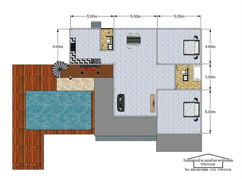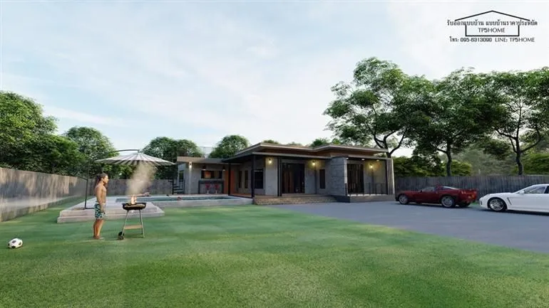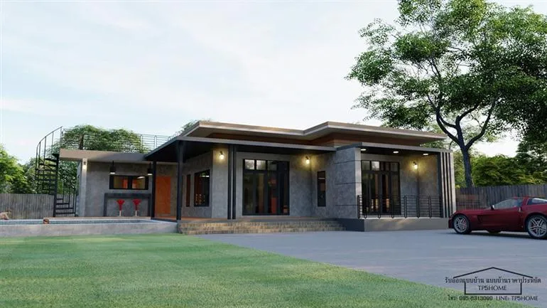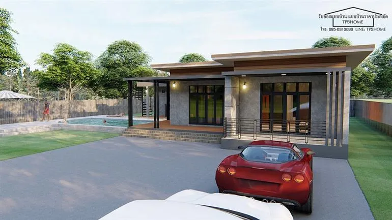 ยังคงมีแบบบ้านสวยๆ จากเพจ TP5HOME มาฝากให้ทุกท่านได้ติดตามรับชมกันอยู่ตลอดเช่นเคยนะครับ เพจนี้เขารับออกแบบบ้าน แล้วก็มี แบบบ้านราคาประหยัด ให้คนที่สนใจได้เลือกซื้อไปสร้างอยู่กันด้วย สำหรับแบบบ้านที่นำมาเสนอกันในวันนี้ เป็นบ้านชั้นเดียวในสไตล์โมเดิร์นลอฟท์ โดดเด่นด้วยการออกแบบให้มีดาดฟ้าด้านบนไว้สำหรับพักผ่อนทำกิจกรรมยามว่างกับครอบครัว รวมไปถึงสระว่ายน้ำติดกับตัวบ้าน ดูทันสมัยไฮโซไม่น้อยเลยทีเดียวครับ อย่างที่บอกว่าบ้านหลังนี้มาในสไตล์ลอฟท์ ตกแต่งผนังทั้งภายนอกและภายใน ตัวบ้านยกพื้นเล็กน้อยออกแบบให้มีระเบียง และลานจอดรถกว้างขวางที่ด้านหน้า