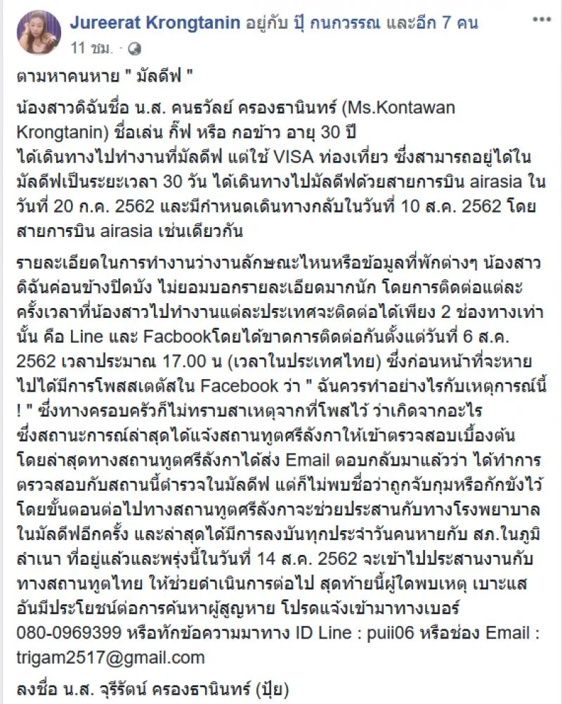 สมาชิกเฟซบุ๊ก Jureerat Krongtanin ได้โพสต์ตามหาน้องสาวของเธอ หลังหายตัวไปที่มัลดีฟส์ โดยระบุข้อความว่า