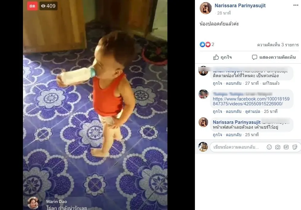 อย่างไรก็ตาม ผู้ใช้เฟซบุ๊กที่ชื่อ Narissara Parinyasujit ได้รายงานอัพเดทสถานกาณ์ล่าสุด โดยโพสท์ใต้คอมเม้นท์ระบุว่า " ตอนนี้น้องปลอดภัยแล้ว"