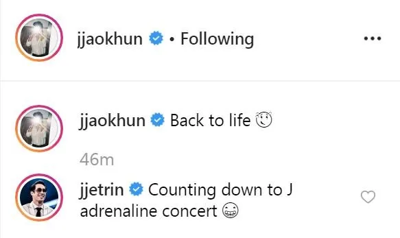 ส่วนคุณพ่อ "เจ เจตริน" ก็เข้ามาโพสต์คอมเมนต์ว่า " Counting Down to J adrenaline Concert " ซึ่งเหมือนกับ คุณพ่อ "เจ" ไม่อยากให้ลูกชายคิดมาก เลยชวนเตรียมไปสนุกกับคอนเสิร์ตด้วยกันที่กำลังจะจัดขึ้นเร็วๆ
