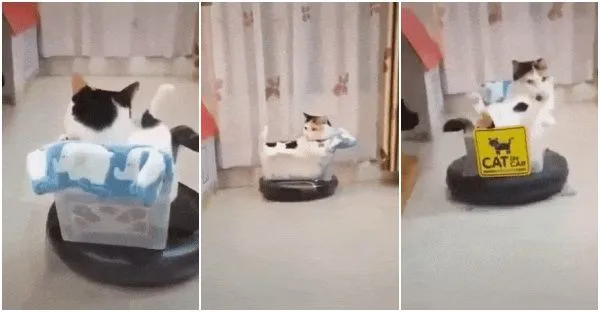 1 ผู้เชี่ยวชาญการทำงานบ้านเป็นอันดับหนึ่ง (น้องเหมียวนั่งอยู่บนเครื่องดูดฝุ่นแล้วปล่อยให้มันเคลื่อนไปรอบๆ