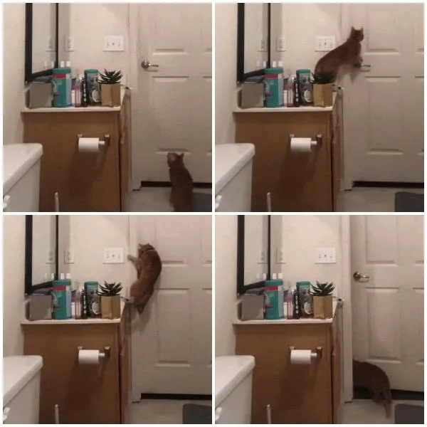 10 “ แมวของเพื่อนร่วมห้องเปิดประตูออกจากห้องน้ำเองเสมอ ฉันตั้งกล้องที่ซ่อนอยู่นี้เพื่อดูสิว่ามันออกมาได้ยังไง”